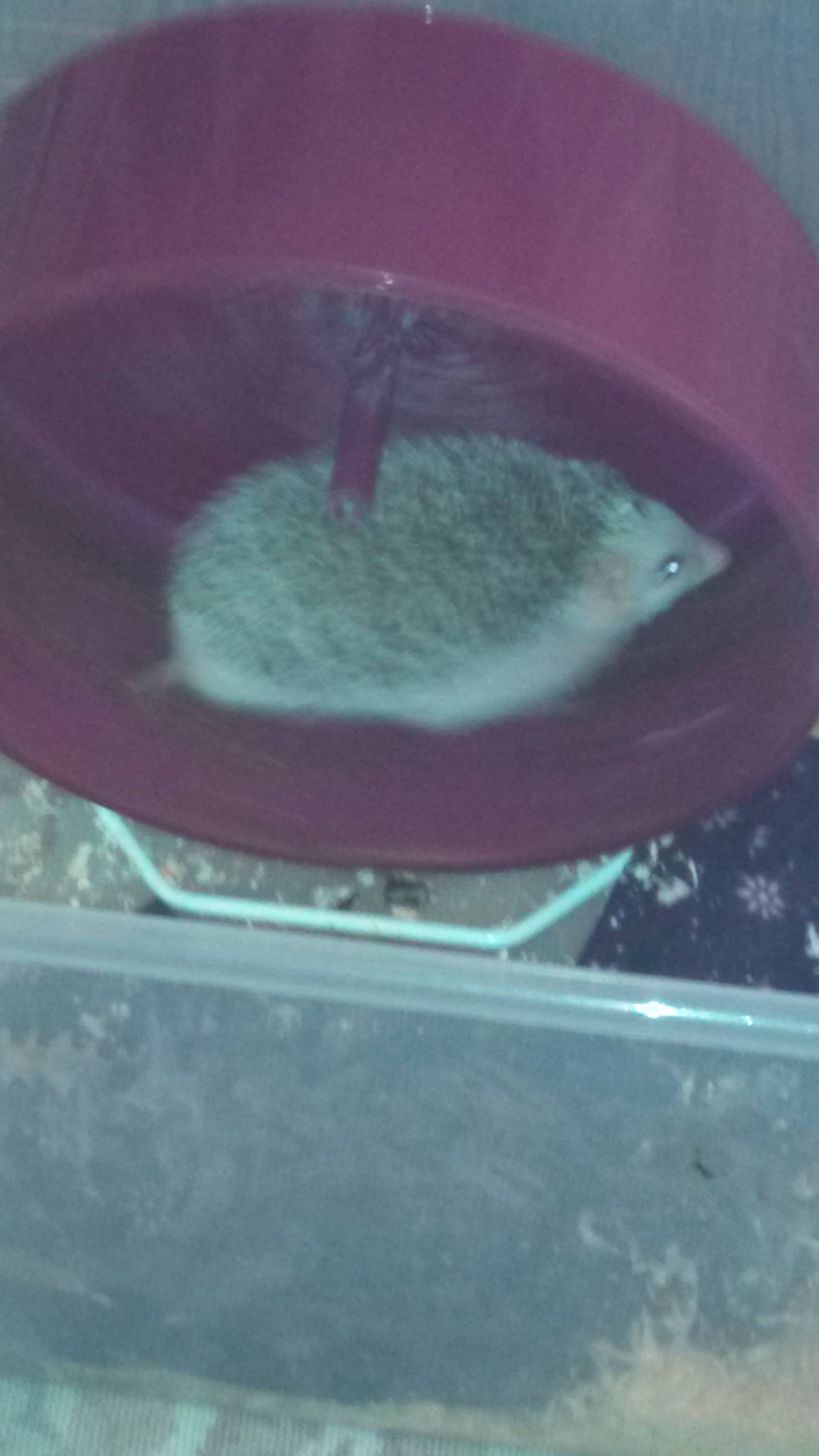 Jenny is around 10 weeks old and a bit, well, large for her size. It seems that as each of her siblings got adopted she began making up for the loss by eating their food, and eventually was eating for six. Oops. She’s been put on a diet since she joined us, and happily given a wheel. It’s rather amusing seeing a hedgie have to jog rather than run, but she’s been steadily decreasing in girth in a healthful way.